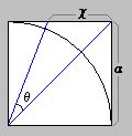 右図のように、一辺の長さが2αの正方形に納まる円をかく。正方形の対角線に対して円の中心からθ角はなれた直線を、正方形の一辺に当たるまで引く。この時 x の長さを求める一般式を答えなさい。