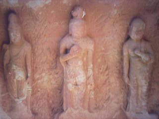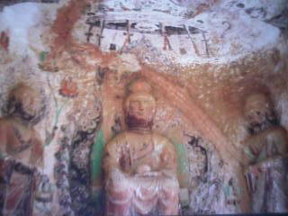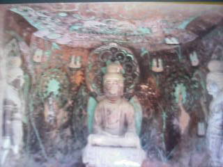 | 第22窟 五尊仏坐立像 裳懸坐に結跏趺坐する如来を中心にして二弟子、ニ脇待菩薩の五尊像であるが、ニ弟子の像は失われている。蓮の花の頭光の緑色と、壁の上ほどに浮ぶ蓮の茎に浮ぶ化生ニ仏が印象的である。 |