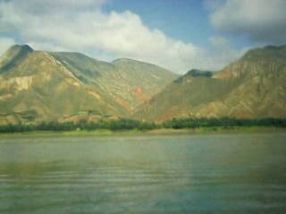 劉家峡ダムまでバスで約2時間かかる。道は険しい断崖の谷底を曲がりくねって登っていく。見上げると斜面は真っ青な空を突き刺す頂きへと続き、今にでも地すべりを起こし崩れてくるような無数の亀裂が横に走りっている。その模様は人が切り開いた九十九折りの山道のようにも見える。道は峠を越え下りとなった。急な斜面に人家が見えはじめ、ようやく劉家峡水庫(ダム)に到着した。このダムは黄河最上流のダムであり水は青く澄んでいた。澄んだ黄河を見たのははじめてである。