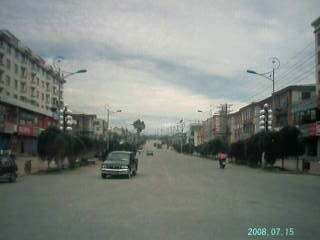 ホテルは十字路の角にあった。ホテルの窓から眺めると西部の街のような雰囲気がただよっていた。目の前にスーパーマーケット(超市)があるが人の出入りは少なく歩くひとも疎らである。しかし朝はひとびとが集りミュージックを流してにぎやかに体操をしていた。北京や江南で見られるような社交ダンスのようなことままだここでは見あたらない。 ホテルの玄関先にでて日本のラジオ体操の第一、第二をやって北麓登山のため身体をほぐした。 |