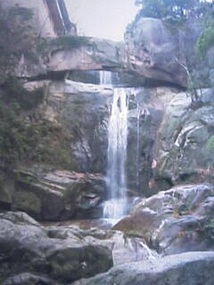 天台山を代表する名勝である石梁瀑布は天台山系の奥に位置する。マイクロバスを下車して曲りくねった急な坂道を下っていくと滝壷に着く。ここから見上げると見事な石の梁が弓なりにかかり二段に重なって滝は梁の下をくぐって落ちている。圧巻は弓なりの石の梁である。武闘映画の格好な場面である。