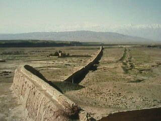 | 長城はここから7キロ先の断崖で終わる 内城のなかに軍隊が駐留した遊撃将軍府の建物や井戸にかぶせた井亭などが再現され当時の右往左往するひとびとの姿が偲ばれる。また城壁に目をやると城壁の四隅には角楼が設けられ四方に睨みをきかせている。馬に乗ったまま登れるという急勾配の坂道を登り城壁に立つ。ここから眺める祁連山は実に見事で感動する。また荒地に続く一筋の長城は映画のセットのように見え、この先の嘉峪関長城第一土敦と呼ばれる断崖で終わっている。 |