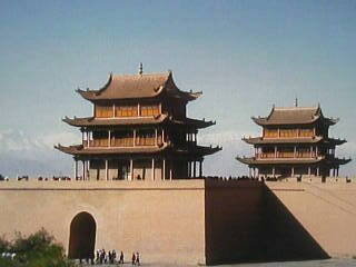 現在見られる長城は明代に築かれたものであるという。東端の山海関からここ西端の嘉峪関まで河北、北京、山西、内モンゴル、寧夏、陜西、甘粛と7つの省、市、自治区に横たわり、長さは5660キロに達している。関所は通常急所に置かれ軍事的要地である。天下第一の雄関と呼ばれる嘉峪関は明代の最西端の要地であった。この丘の上に内外二重の城壁をめぐらせた嘉峪関がある。