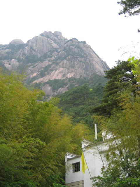麓から峰峰を見上げると黄山を大きな岩の塊である。