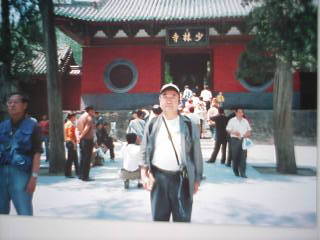 山門 松柏の中に朱の壁と丸窓が記憶にのこる山門が我々を立ち止まらせる。予想より小さい山門であると感じた。門口の上に金文字で書かれた少林寺という文字が目をひく。石段を踏みあげて山門をくぐる。正面に布袋様みたいな阿弥陀様がどっしりと腰をおろし微笑んで我々を迎えた。 |
