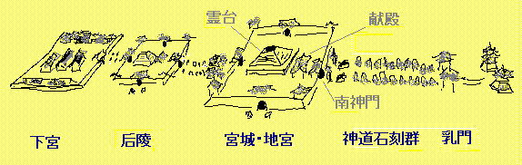 永定陵は上宮、宮城、地宮、下宮で構成されている。ほかの陵もこれと同じであるようだ。