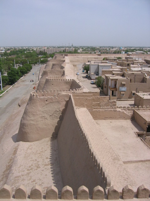 周囲2200メートルのイチャンからは高さ7〜8メートルの城壁で囲まれている。壁は防御機能を高めるため間隔をおいてせり出しがあり、表面はでこぼこで粘土細工のように素朴である。上端は尖塔形の盾が並んでいてその隙間が銃眼の役目を果たしている。
