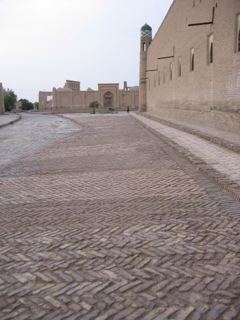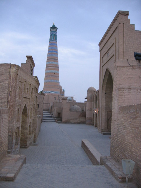 ムハマッド・ラヒムハン2世(1863〜1910)と息子のアスファンディヤル・ハン時代のヒヴァハン国の第一大臣を勤めたイスラム・ホジャが1908〜1910に建てたメドレセとミナレットである。