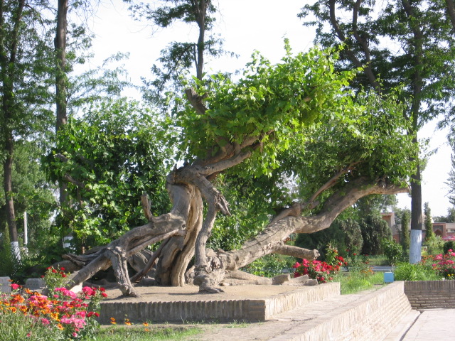 外国で桑の木を見たのは中国新疆ウイグル自治区のトルファンが最初であった。私が高校時代までは田舎では養蚕が盛んで桑畑は近場に多く見られた。だから桑の木自体はめずらしいと感じないが、トルファンのそれはは大木で圧倒された。しかし、今回ウズベキスタン会見した桑の古さといい大きさといい、数の多さといいトルファンをはるかに上回るものであった。
