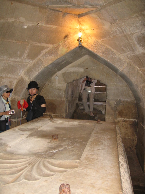 20世紀になって発掘されたチムールの納骨堂。形は十字架型をしている。明遠征の時に没したチムールの遺体はこの堂に納められることはなかった。だから納骨堂には石棺床が横たわっているだけである。この上には廟と追善モスクが建てられていた。