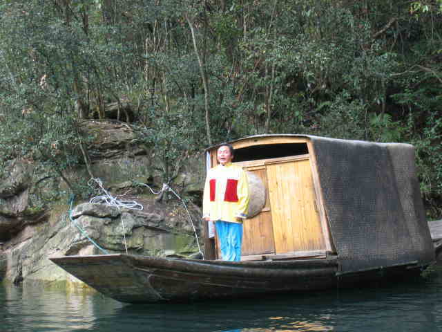 土家(トチャ)族の舟 船からボートへ拍手を送ると土家族の男女が奥からから出てきて歌を披露してくれる。 鳳凰古城と同じ嗜好である。 彼らの素朴な歌声は爽やかに湖面に響き渡りヤホーと呼びかけ歌を締めくくる。 我々はありがとう!!の拍手を贈る。 |