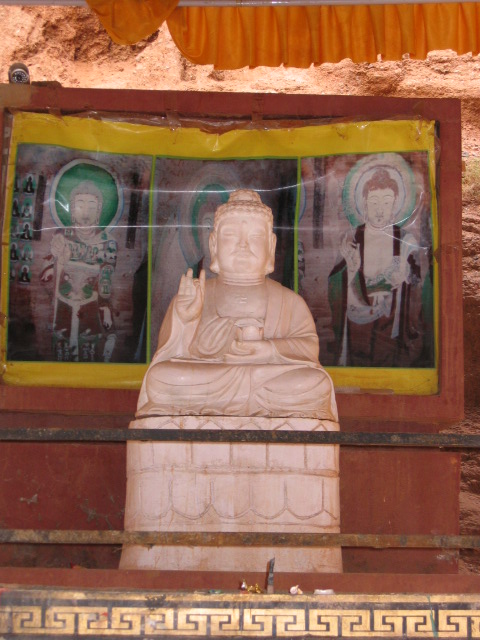 断崖の下に設けられた仏壇の仏像は前述した坐像、後ろの壁画の写真は左が盧舎那仏、右が薬師瑠璃光仏と思われる。