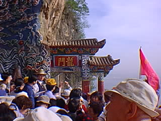 があり観光客でごった返していた。 眼下にシ眞池が開け午前の陽光を受け霞んで見える。昆明民族村も見える。 龍門の突起に触ると願いが叶とか岩に掘られた穴に手を突っ込むとお金が千倍にもなるとか 言われて言われるまま試しながら混雑する石道を下った。 また、この一帯はお寺も多く