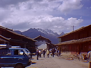 小川が流れ柳の木のある小道を麦畑やトウモロコシのハウスを見ながら行くと束河村に入る。 石畳の道沿いの民家は紅土の饅頭を積み上げた高い塀で被われていて中庭や母屋は見えない。 対聯(チーレン)と言う旧正月の赤い飾り紙が両側に張られた門扉が厳重に閉ざされていて それぞれの家がなにかを隠してでもいるように感じられた。 村の広場ではジャガイモなどを物物交換するトラックや小川で洗い物をする女達がいた。 顔は黒く健康的であり我々に余り好奇心を持っているようには感じなかった。