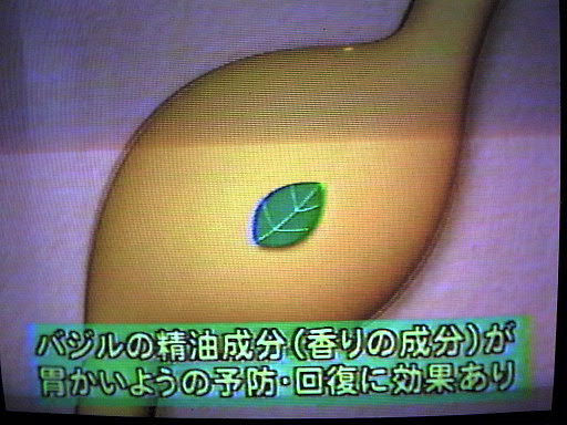 2000年4月30日 テレビ朝日の得するテレビです 例によってオープニング 今回はバジルのお話しです 日本テレワークという制作会社のスタジオですが、後ろの画面にバジルを写すために、デジタルビデオで撮影したものをケーブルで繋いで映像として出しています。結構細かいところに気が配られています。 今回はわずか5秒の出演でした
