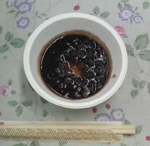 定番のお汁粉(善哉)です。お餅は各ご家庭の残りものです。小豆は缶入りゆで小豆です。
