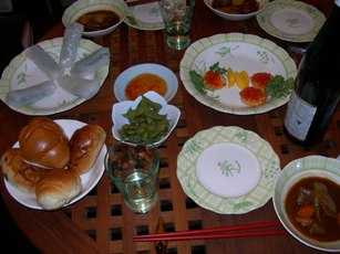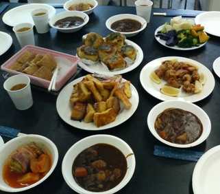 お料理はグループごとです。ビーフシチュー、唐揚、ロールキャベツ、野菜のチーズフォンデュ、揚げお握りなど力作が並びました。デザートもチョコレートを使ったケーキが数種。それにインド風の甘い紅茶などなど。