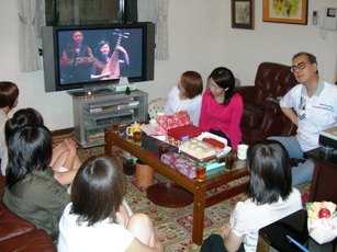 こちらはディナー組です。大きなテレビで女子十二樂坊を見ています