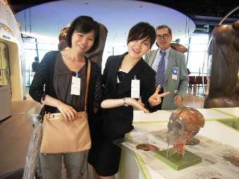 人体模型にVサイン。左手が、宇宙船の居住棟の実物大模型です。中に、キッチンやトイレがあります。