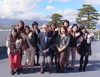 研究所の屋上で記念撮影.前の日の大雨が晴れました。雲にかくれているのが富士山です.