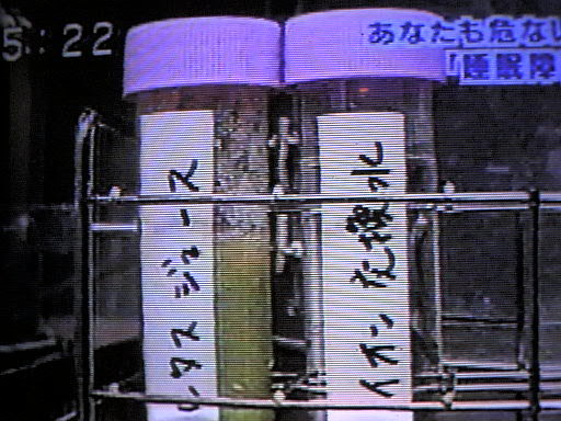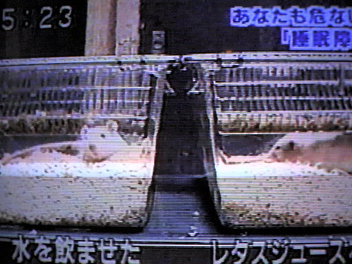 相変わらずレタスの睡眠誘導物質の話しです。この席は狩野さんの席なのですが、ライトの都合上借りています。小型のデジタルカメラでの撮影で、音声も望遠マイクで撮っていますが結構ちゃんと撮れています。 レタスジュースとイオン交換水を用意してラットに飲ませます レタスジュースを飲んだラットが眠りました。 ただこの実験は、別の場所でやったものです。番組だと一連の映像なのでうちでやったように見えましたね。