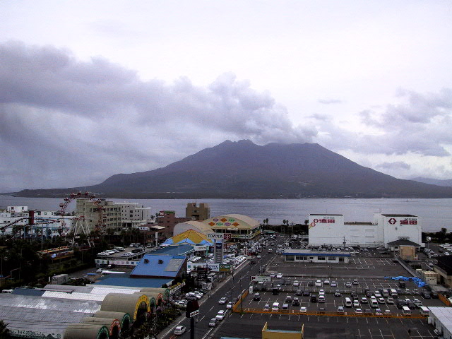 ホテルの窓から眺めた桜島です。噴煙を盛んに上げています。時間とともに噴煙の様子は変わります。