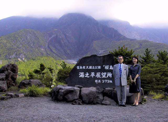 フェリーで桜島に渡り、その中腹での記念撮影です。これから上は、危険なので立入り禁止です。親子で記念撮影しているみたいですね。