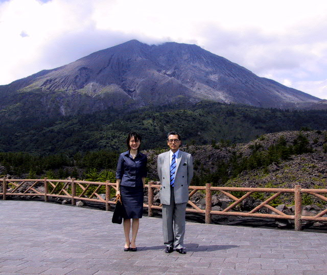 これも桜島ですが、裏側のふもとです。風も強くて、噴煙も少し混じっています。髪をシャンプーしたくなりました。これは、親子というより社長と秘書といった感じですね(−。−)。