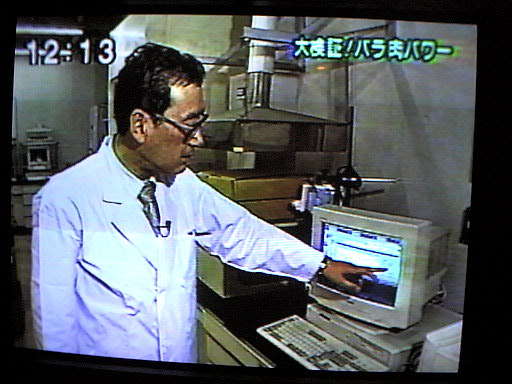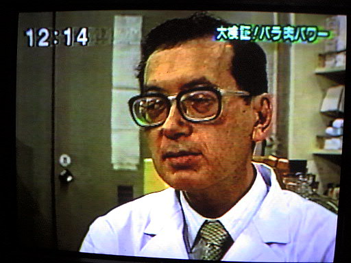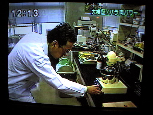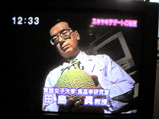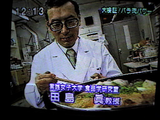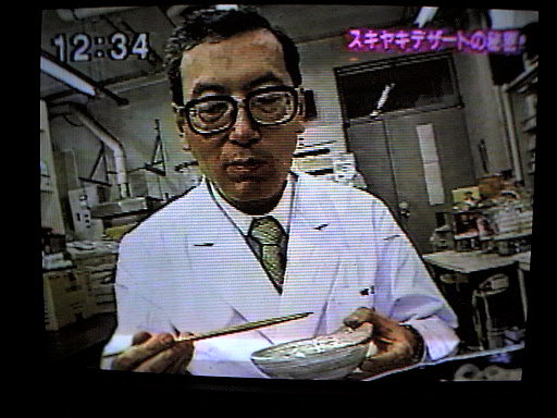 オープニング 今回はすき焼きを食べています 今回は、測定も自らやっています 例によってもっともらしく解説 この機械(分光光度計)が一番時間がかからないのでおなじみです テレビというのは太って写りますね この2人が木曜日のレギュラーです このディレクターはこういうショットが好きなようです 手に持っているのはメロンです 以上、今回は合計4分くらいの出演でした