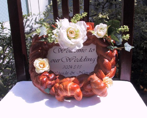 ウェルカムブーケですが、パンでできています。新婦がパン学校で教えているからです。