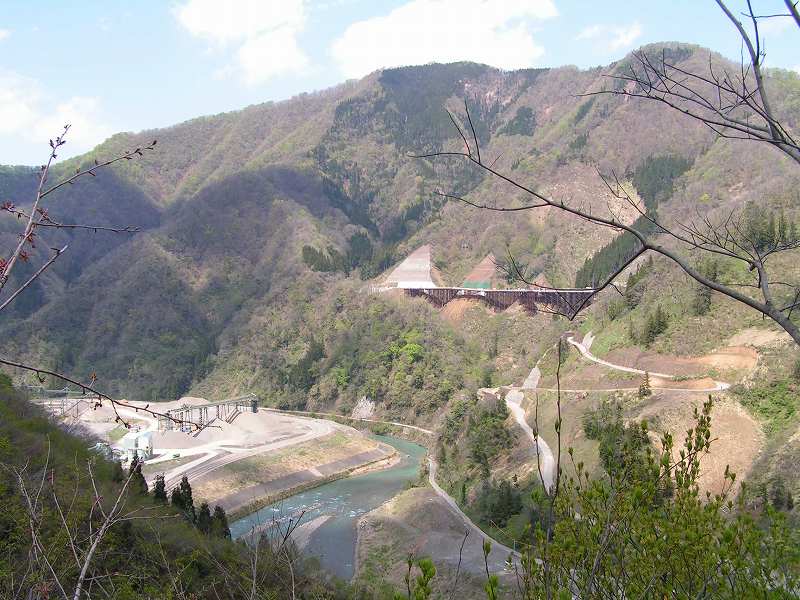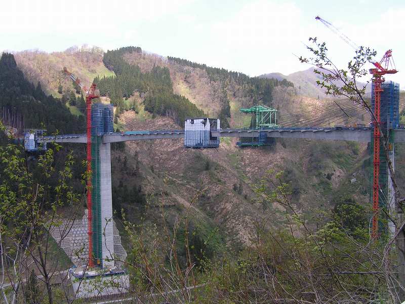 両端の支柱の赤い筒は作業用のエレベータです。 |