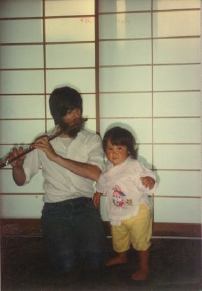 Exhibit #1, a photo taken in our tiny 'apartment' room. Eh? Shoji screens in a Canadian apartment? Well, they certainly weren't there when I moved in! I guess I was pretty infatuated with 'things Japanese' at that time, and rather than hanging curtains on the window, I built this screen. (It was very well made too, using no nails or glue; everything fit together very tightly) As for that flute, I wonder if 'little' Himi-chan has any memory at all of her father playing a musical instrument? I very much doubt it, as a year or so after this picture was taken, the flute went into a box, where it has remained ever since ...