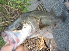 タイドバイブ で攻めてみる。あんまり期待せず途中ジャークを適当にかましてると、なんかきた!しかし、すぐにばれる。多分30〜40センチくらいのやつ。いるじゃん(^^)、ってことで気合いが入る。今度はアップクロスで タイドバイブ を投げて明暗部の境目でのジャーク一発目、ゴン!きた〜、しかもなかなかいい引きだ。上げてみると今度は68センチのシーバス。やっぱり足場が近いとばらす心配が少なくていいね。でもなんかこの魚、背びれが何かにパックリ喰われている。海は怖いね。