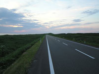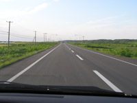 ここは遠別を過ぎたあたりかな? 左右に牧草地が広がる中、ひたすら真っ直ぐな道が北に向かいます。 |