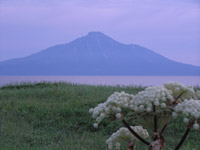 | 海の向こうに見えてきた利尻富士! ちょっと霞んでますけど・・・ 手前に写っている花は本州では見たこと無い花です。しかし北海道ではよく見かける・・・ |