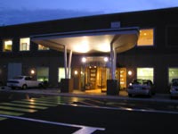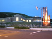 | ここ「童夢」は日本最北端の温泉です。右の写真で案内板の左手に見える部分が温泉建屋を正面から見たところです。この建物、真横から見ると船の形をしています。 | |