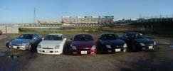 ドライビングスクール及び体験走行会が終わった後は、第1・第2コーナー内側にある駐車場で閉会の挨拶があり、そこで解散となりました。というわけで、最後は当日集まったプレリュード5台を並べて、観覧席をバックに記念撮影!
