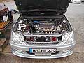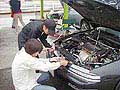 | TriangleTales製のラジエターフードの装着作業中。これって、今年のフェスタで買った奴かな? 手伝ってるのは、中国メンバーのRYOさんです。 |