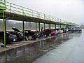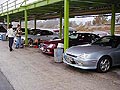 順番を待っている所へ、まつぞーさんが到着。ピットの屋根下に荷物を下ろし終わるやいなや、ラジエターフード装着作業を開始してました。
