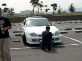 | ナンバー装着部分を細工中のKYUさん。 まつさんもリアバンパーの補修塗装をしてはりました。 |