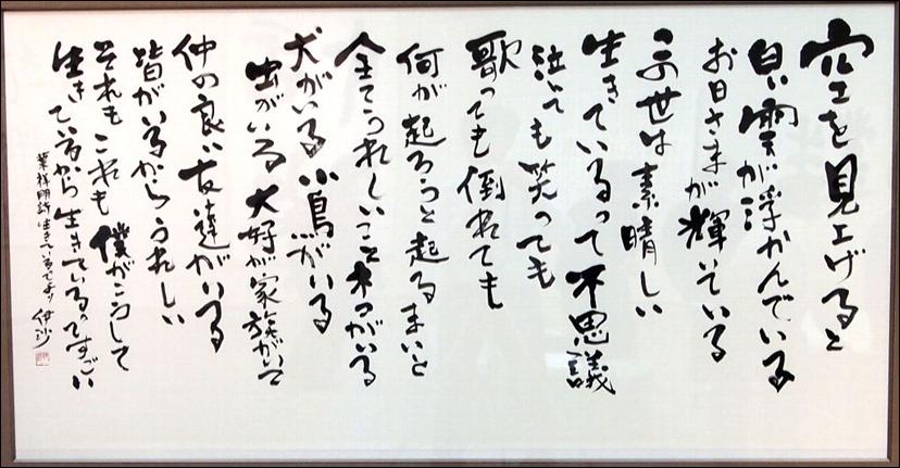 山口塾の存在を意義づけるとすれば、(人間らしく生きるのにはどうあらねばならないか)を考える、その上に立って(書をどう意味づけするか)→(人間 生きるための書を作る)でありたい。今回は書道展ですが、その他の勉強もする!(人間どうあらねばならないか?)を絶えず考え実行する集団でありたい。命の輝きを金子みすずさんは『みんなちがってみんないい』と表現されました。また更に、人間は生きていくうえで余分なものは一つもない。今で充分の世界があるのです。こういう世界の輝きを表現したい。幸い我が(山口塾生)は、みんな輝きみんな個性豊かに暮らしております。そういう生き様を世に問うのが(山口塾書道展)でありたい。