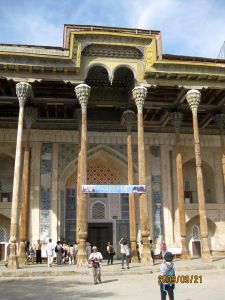 みんなが戻ってきて、次はレギスタンス広場へ。レギスタンというのは「砂漠の地」という意味だそうだ。ここはティムールの時代、バザールもあり町の中心地だった。メドレッセ(神学校)、モスクがセットになってある。ウズベキスタンではどこでも観光地では写真を撮る時は撮影代を払わなければならない。額は3000〜4000スム(180円から240円)とたいしたことはないが、必ずと言っていいほど名所では取られる。警備している軍人が、メドレッセの上に上がると町中が見渡せて、いい眺めだからどうだとしつこく誘ってきたが5ドルだと言うのでやめた。ここで写真を撮っていた若者に声をかけて私たち全員の集合写真を撮ってもらったら、なんと彼は日本人だった。
