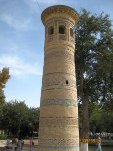 ブハラに着く少し前に、ギジュドゥバンにある陶器工場に寄った。私たちが行くと、ろくろを回して陶器作りの実演をして見せてくれた。ここのご主人は金沢の九谷焼の窯元へ2年間修行に行っていたそうだ。パン焼き窯も近くにあり、そこではウズベクのパン、レピョーシュカを焼いていた。ナンと同じように窯の壁面にパン生地を貼り付けて焼く。ちょうど焼きたてのパンを一つもらってみんなで食べたが、焼き立てなのでとてもおいしかった。青いぶどうも出してくれ、一緒にご馳走になった。こちらのぶどうは一般的に種がなく、皮も薄く、皮ごと食べることができる。そしてできた陶器を売っている奥のほうの部屋へ案内された。別に買わなくてもいいと言っていたが、まあ、せっかくだから記念にお皿を3枚買った。お皿の表面に上薬のはげているところが3箇所あるので、「これはどうしてなんだ」と聞くと、焼く時にお皿の上に3本足の金具を置いてその上にまたお皿を載せて焼くのでそうなるのだとの説明だった。日本ではちょっと考えられない。