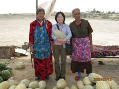 更に少し歩くと箒の束と玉ねぎの山が店先においてあった。店ではスイカやメロンかぼちゃが山のように並べて売られていた。「メロンを買って、ここで食べさせてくれないか」と聞いたら、「いいよ」と言うので、黄色くて丸いメロンを1個むいてもらうことにした。店の中で今まで店の人たちが座っていたチャイハナにあるような席を空けてくれて、奥から毛布を持って来て敷いてくれた。そこに座ってメロンをむいてくれるのを見ていると、途中で「これは甘くないから捨てる」といって捨ててしまい、別の同じようなメロンをもってきてむいてくれた。そしてこれは甘いからと言って、食べやすいように切って出してくれた。確かに甘くて食べると汁が滴り落ちるメロンだった。3人で腹いっぱいメロンを食べ、お金を払おうとすると「あなたたちはお客さんだからお金は要らない」と言う。何回かそれはダメだから、お金を受け取ってくれと言ったが、頑として受け取らなかった。何かあげる日本のお土産があればよかったのだが、何もなく店の小さな男の子に可愛いポケットティッシュと飴を2個あげただけだった。