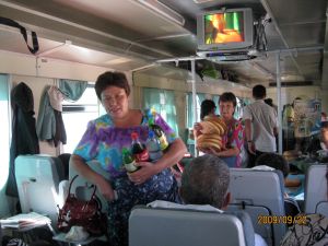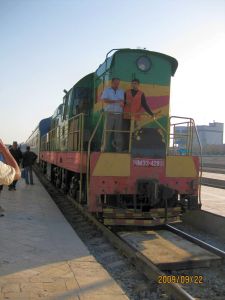 7時にはガイドのナースチャと運転手のニコライさんがやってきた。駅まではかなりあり、車で20分ほどかかった。町の中心部から離れたところに鉄道の駅があるのが不思議だ。列車までスーツケースを運んでくれる人達がいて、台車で運んでくれた。列車はブハラ始発のタシケント行き特急シャルク号でチェコ製のディーゼル機関車に牽引された10両編成くらいの列車だった。1等から3等まであり私たちは2等に乗った。ところがガイドのナースチャは3等ということで隣の車両になった。私たちの車両は真ん中に荷物置き場があり、それに向かって通路の左右に2人掛けの席が向かい合ってある。私たちの座った席は進行方向と反対で後に向かって走っていくことになる。みんなのかばんは中央の荷物置き場にあったが私たちのカバンがない! 「さっきは乗車口のところにあったよ」と他の人が言ってくれたが、その後どこへ消えたのか。盗られたのかと思って大騒ぎしていたら、網棚の上にあった。小さなカバンだったので網棚に上げてくれたのだった。これで一安心。
