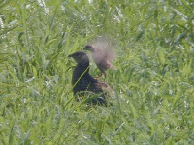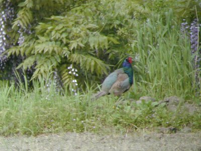 春になると、コー、コーと遠くで鳴き、バサバサと羽音が聞こえてくるのがキジのオスである。 日本の国鳥であるが、猟が許される時期があり食べる事もできる可哀相な鳥でもある。 それほど、人間を恐れる事もないが、林の中では、時々、いきなり飛び立つことでこちらの方がびっくりさせられる事も多い。 重たい体のため、離陸がうまくできず直ぐに着陸してしまう鈍臭い鳥である。 繁殖期はきれいな羽色で、太陽をいっぱいに受けた体は何とも言えない美しさである。派手なオスに比べメスは地味である。 |