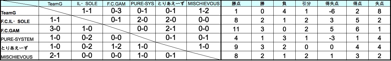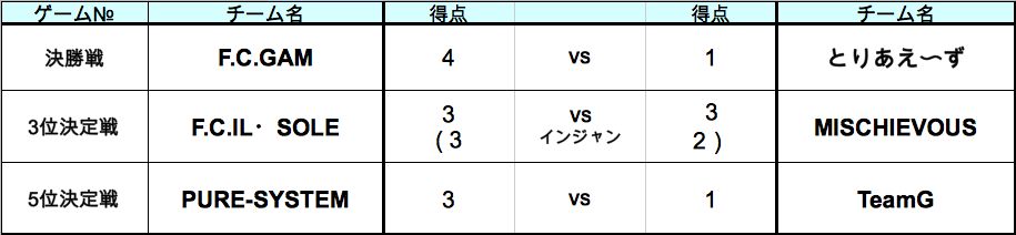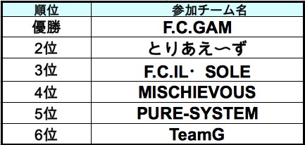 ![]() 優勝チーム F.C.GAMさん ![]() 準優勝 とりあえ〜ずさん ![]() 3位 F.C.ILSOLEさん ![]() 4位 MISCHIVEOUSさん ![]() 5位 PURE-SYSTEMさん ![]() 6位 teamG |