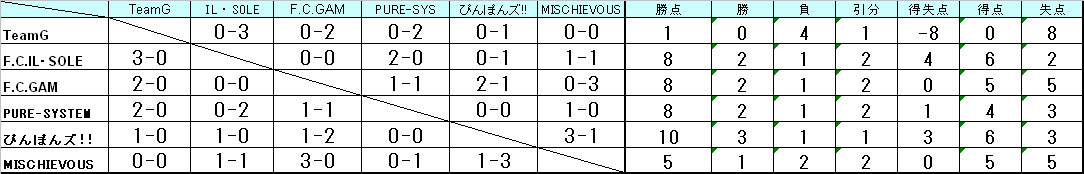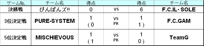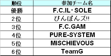 ![]() 優勝チーム F.C.IL・SOLEさん ![]() 準優勝 ぴんぽんズ!! ![]() 3位 F.C.GAMさん ![]() 4位 PURE-SYSTEMさん ![]() 5位 MISCHIEVOUSさん ![]() 6位 teamG |