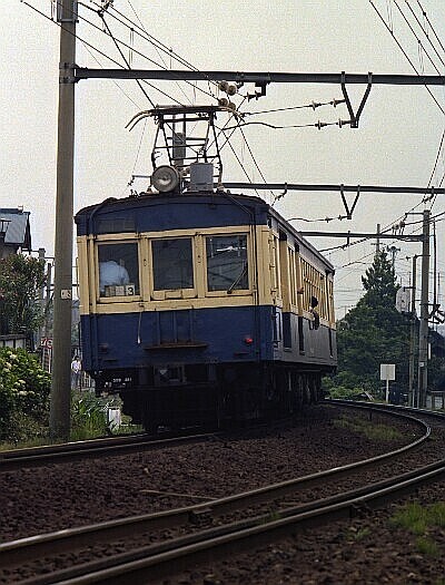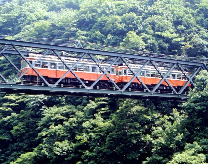 時期不明、登山鉄道電車。今も同じような風景が見られますが、大きな地震がくると再建は難しいので、来ないうちに撮っておいたほうが良いですよ。