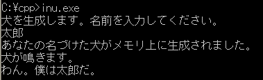 cout<<"あなたの名づけた犬がメモリ上に生成されました。"<<endl;